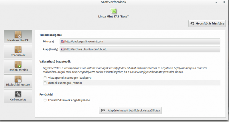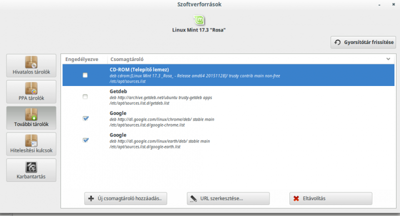 Mintben a tárolók máshogy néznek ki, Fő (rosa) http://packages.linuxmint.com, Alap (trusty) http://arcihive.ubuntu.com/ubuntu van, további tárolónak a csak google earth és chrome van beállítva.