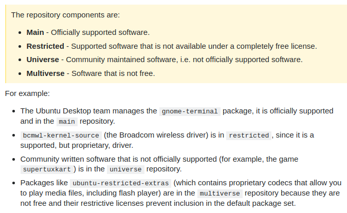 Az alap forrásoknak, összetevőknek csak az Ubuntu-alapú rendszereken ez az elnevezése, mert például a Debian-alapú rendszereken egész más: https://wiki.debian.org/SourcesList#Component