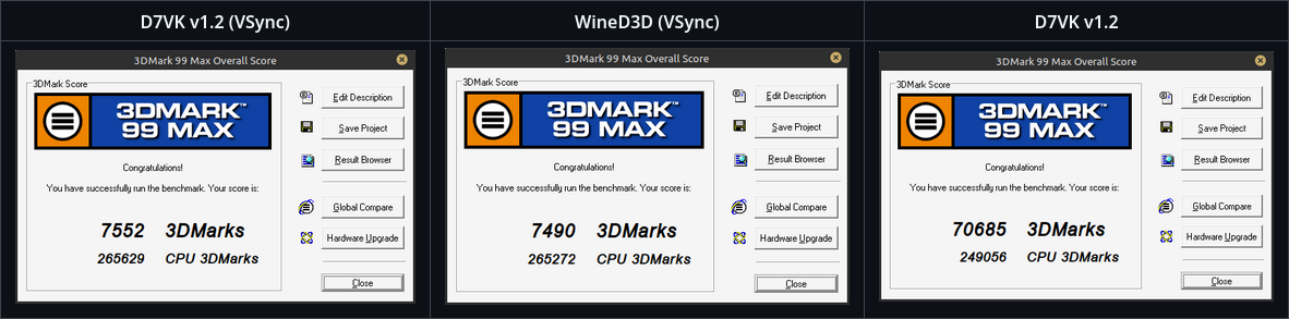 Néhány jól működő cím a D7VK 1.2 alatt: Tomb Raider: Chronicles, Battlezone II: Combat Commander, Drakan: Order of the Flame, Indiana Jones and the Infernal Machine, és még sok más. Teljesítmény szempontjából is ígéretes a D7VK: például a 3DMark 99 MAX benchmarkon jelentősen jobb eredményeket mutat a WineD3D implementációhoz képest, kiemelve a Vulkan-alapú megoldás előnyeit a régi játékokhoz.